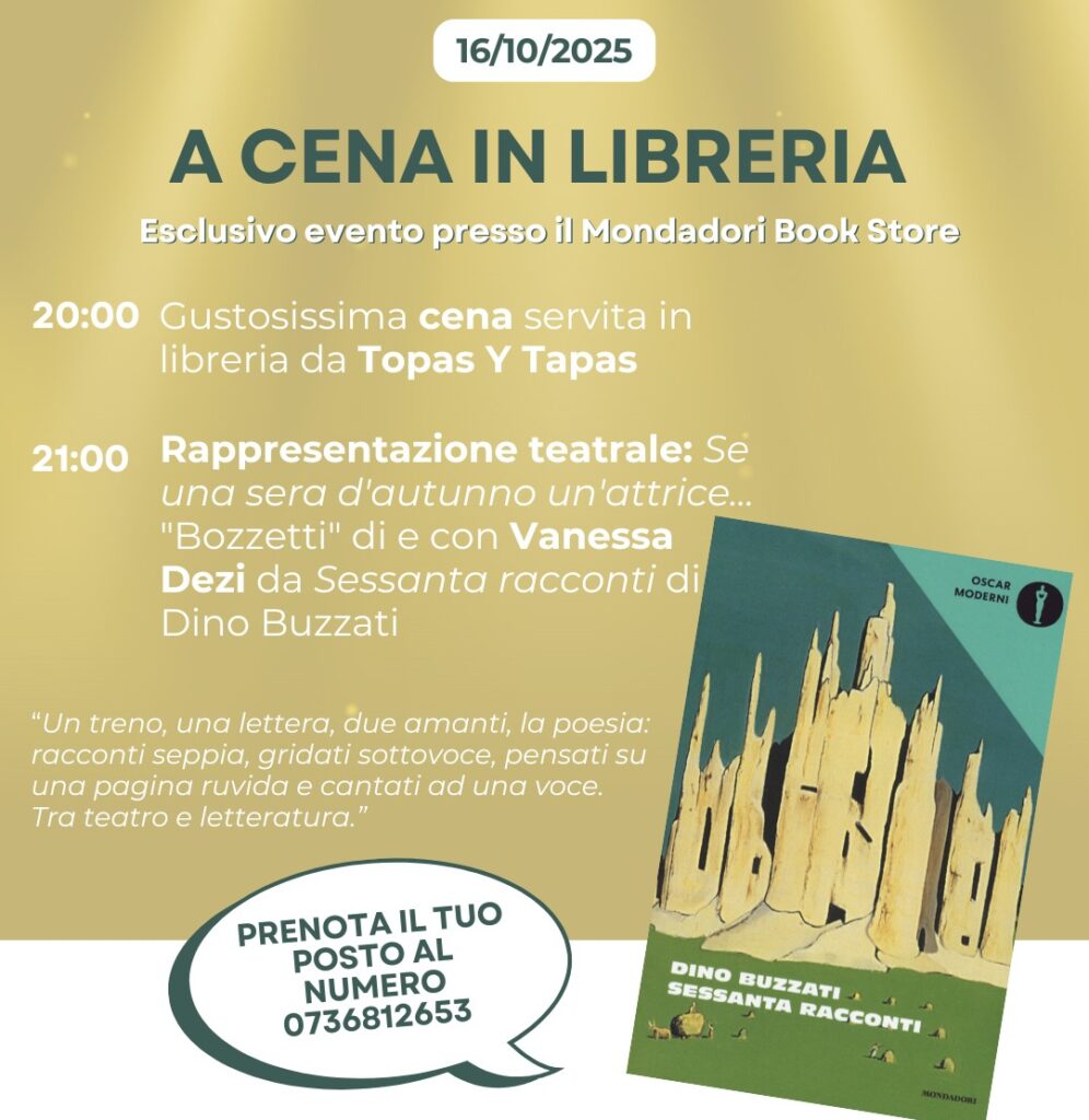 Giovedì 16 ottobre 2025📖 A cena in libreria – tra parole, sapori ed emozioni. Un’esperienza unica: 🍷 Una cena firmata Topas Y Tapas🎭 Una performance teatrale con Vanessa Dezi📚 Un viaggio tra i “Sessanta racconti” di Dino Buzzati📍 Mondadori Book store – Centro Commerciale Città delle Stelle ☎️ Prenotazioni al 0736 812653 📌 Posti limitati – ti aspettiamo per una serata tra gusto e letteratura!